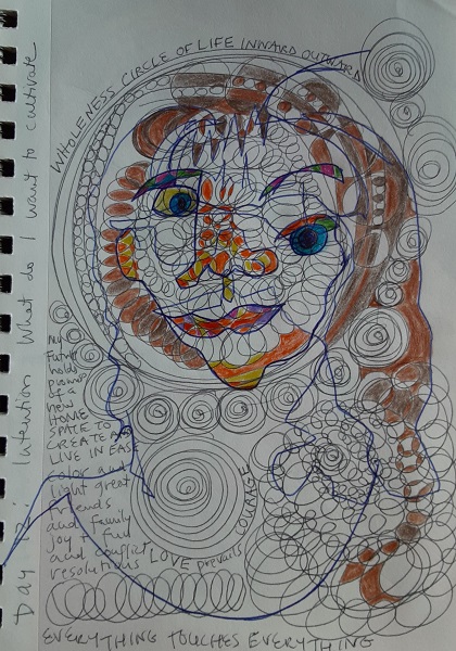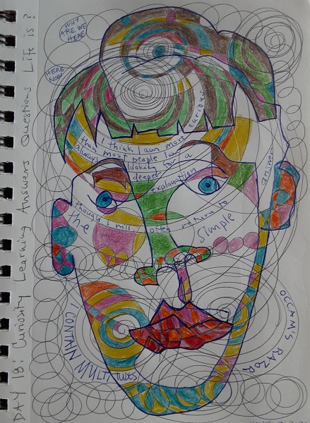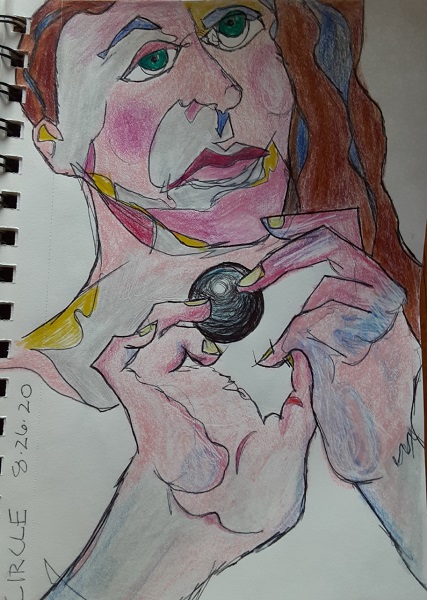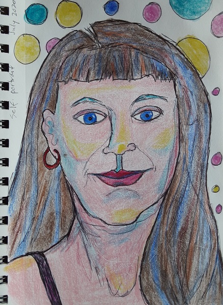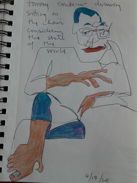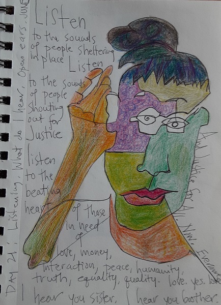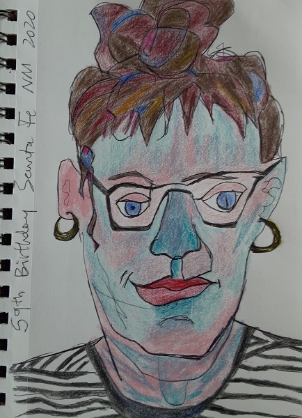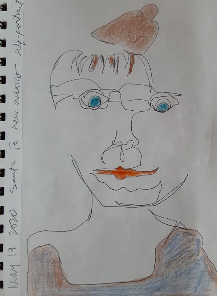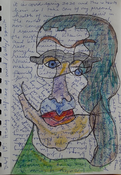 At the urging of my friend Diane Sherman, partner in art, yoga, teaching and philosophical musings, I embarked on a journaling project of a series of quick, 1-minute contour drawing portraits. Most include words and markings that reflect my current thoughts, worries and revelations, as a chronicle of my day-to-day self for one month in the midst of the confusing pandemic.