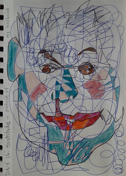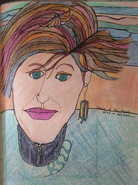 What’s a contour drawing? It’s a playful and quick sketch with pen to paper without looking at anything but your subject. Without lifting the pen or assessing or correcting progress, one captures the visual by instinct with spontaneity and energy. The range of abstraction to realism can be quite long, as you will see! Contour drawings are fun to do, a great exercise in truly seeing your subject, a warming up of creative muscles, and accessible to anyone! Later, I colored in some of these drawings, one of which was featured in the book, “The Magic of Art Journaling,” by Diane Sherman.