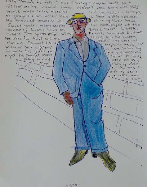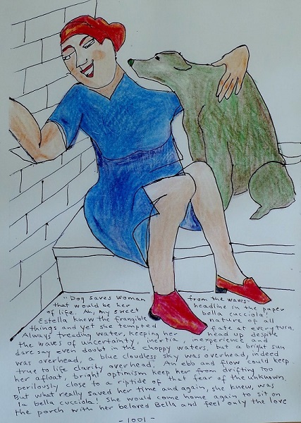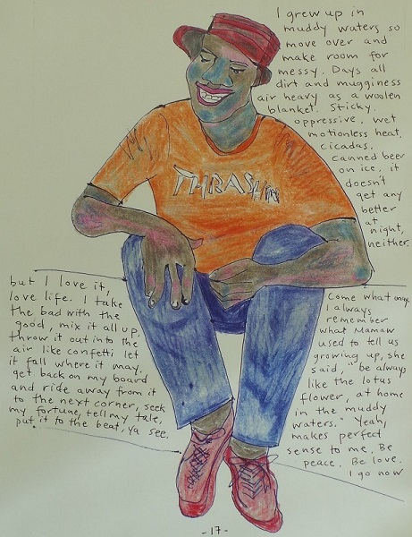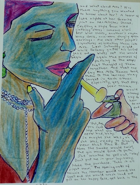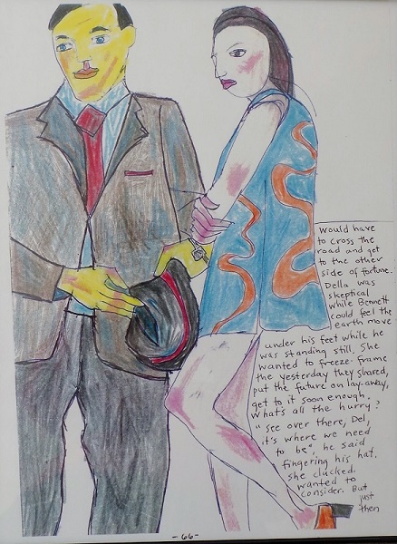 In addition to my love for creating visual art, I love words and storytelling and have often added my writing to artwork. This series of 9″ x 12″ drawings with narrative text accompanies a series of paintings of the same name that was exhibited at Subterranean Gallery on Bancroft Way in Berkeley, California. Here are eight of the over 50 drawings for the exhibition. Click the right arrow (or swipe for mobile) to view all drawings as a slideshow.